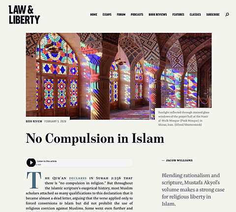 The new Cato book, No Compulsion in Religion—No Exceptions: Islamic Arguments for Religious Freedom, edited by Senior Fellow Mustafa Akyol, is being launched this week with a public book forum. And just days ago, on February 5, the book’s first scholarly review, titled “No Compulsion in Islam,” came out in Law & Liberty magazine.